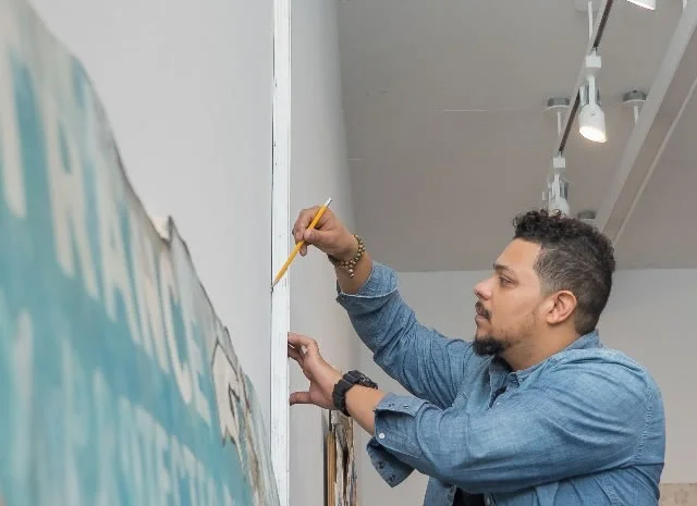 What results is a cross pollination of painting, drawing, collage, and sculpture, and accumulations of domestic items, including flooring, furniture parts, frames, moldings, and doorknobs, to name a few. Using domestic items collected from multiple geographies, my neighborhood being one, is a way to map a personal journey, and respond to the constantly evolving social landscape; creating a kind of field guide by which to navigate the communities in which I live and travel."